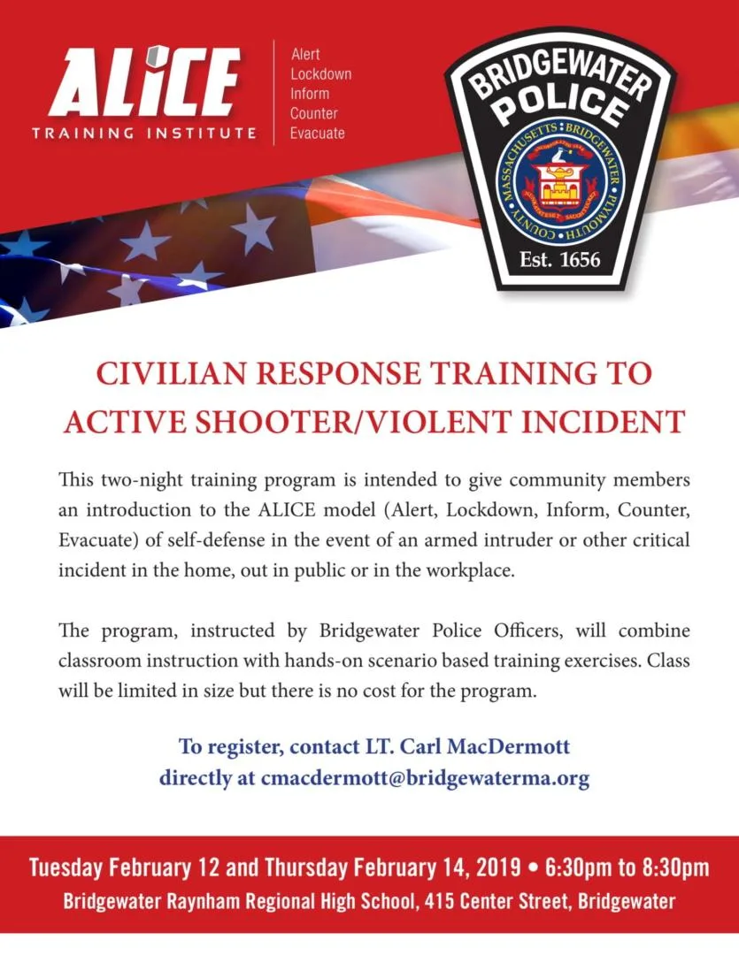 Those interested in attending the program should register with Lt. Carl MacDermott by emailing him at cmacdermott@bridgewaterma.org.