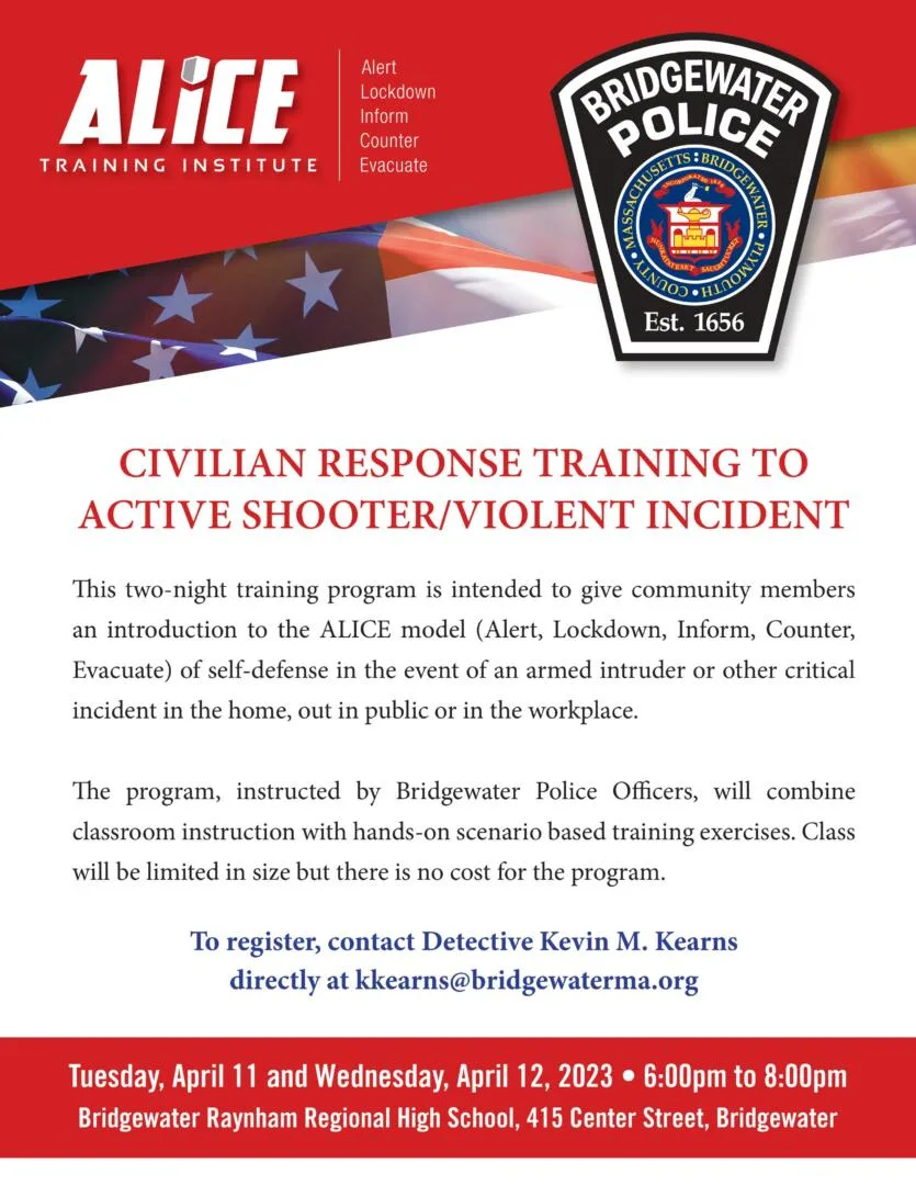 The Bridgewater Police Department will host a two-night training program for residents on how to react to an active shooter or other threat. The course, which will be taught by Bridgewater Police officers, will combine classroom instruction with hands-on, scenario-based training exercises.