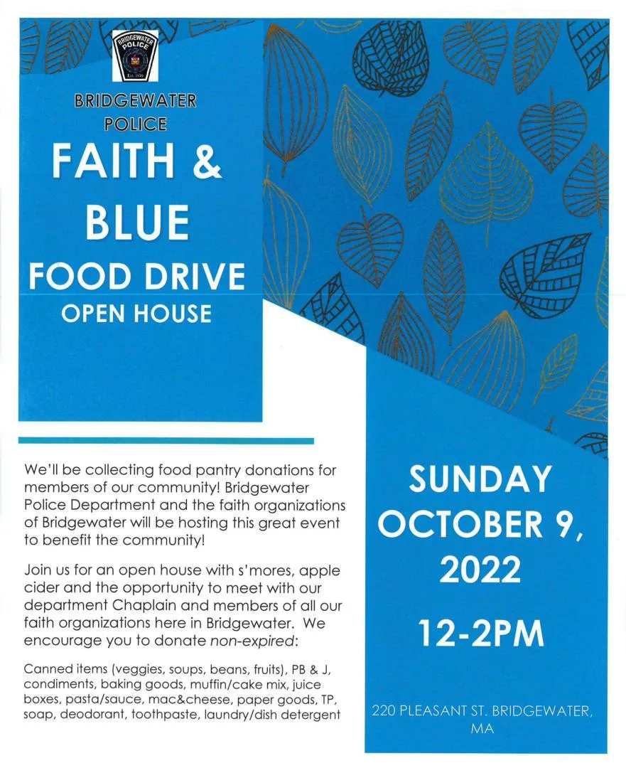 The Bridgewater Police Department and the faith organizations of Bridgewater have joined together to host a food drive and open house in celebration of National Faith & Blue Weekend.