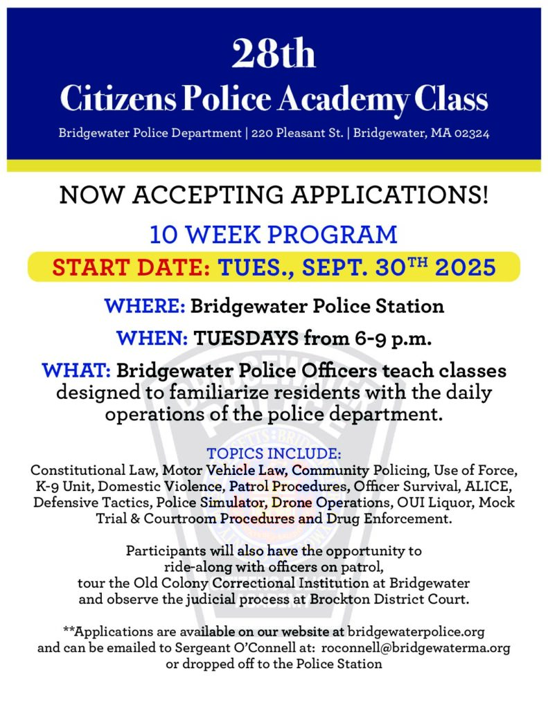 The Citizens Police Academy is a program designed to give Bridgewater residents an opportunity to learn more about their Police Department and the services we provide. This program is not intended to train participants to perform law enforcement duties, but rather create better-informed citizens and develop a working relationship with the community to solve problems within the Town.