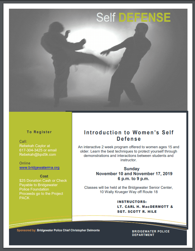Introduction to Women’s Self Defense will be held on Nov. 10 and Nov. 17, 2019 from 6 p.m. to 9 p.m. at the Bridgewater Senior Center, 10 Wally Krueger Way (off Route 18).