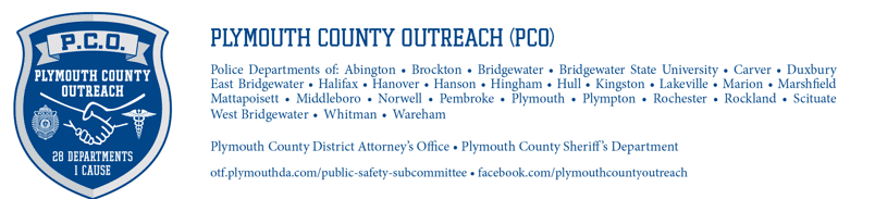 Plymouth County Outreach is a collaborative of police departments throughout Plymouth County led by the following chiefs: Abington Chief David Majenski, Bridgewater Chief Christopher Delmonte, Bridgewater State University Chief David Tillinghast, Brockton Chief John Crowley, Brockton Police Lt. Richard Linehan, Carver Chief Marc Duphily, Duxbury Chief Matthew Clancy, East Bridgewater Chief Scott Allen, Halifax Chief Ted Broderick, Hanover Chief Walter Sweeney, Hanson Chief Michael Miksch, Hingham Chief Glenn Olsson, Hull Chief John Dunn, Kingston Chief Maurice Splaine, Lakeville Chief Frank Alvihiera, Marion Chief John Garcia, Marshfield Chief Phillip Tavares, Mattapoisett Chief Mary Lyons, Middleboro Chief Joseph Perkins, Norwell Chief Ted Ross, Pembroke Chief Richard Wall, Plymouth Chief Michael Botieri, Plympton Chief Patrick Dillon, Rochester Chief Robert Small, Rockland Chief John Llewellyn, Scituate Chief Michael Stewart, Wareham Chief John Walcek, West Bridgewater Chief Victor Flaherty and Whitman Chief Scott D. Benton.